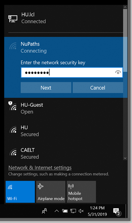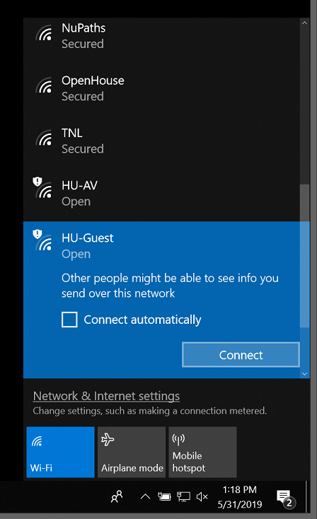 Step 1 - On your Windows computer open your list of wireless networks and select HU-Guest and choose connect.