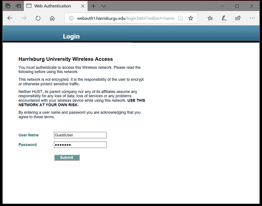 Step 2 - Open a browser such as Internet Explorer or Google Chrome and browse to https://harrisburgu.edu. You will be directed to the guest login page.