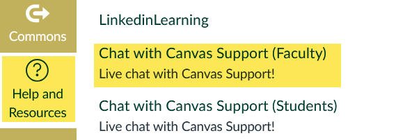 Simply click on the question mark icon in the Canvas global navigation to access Help and Resources, then select to chat with or call Canvas Support.